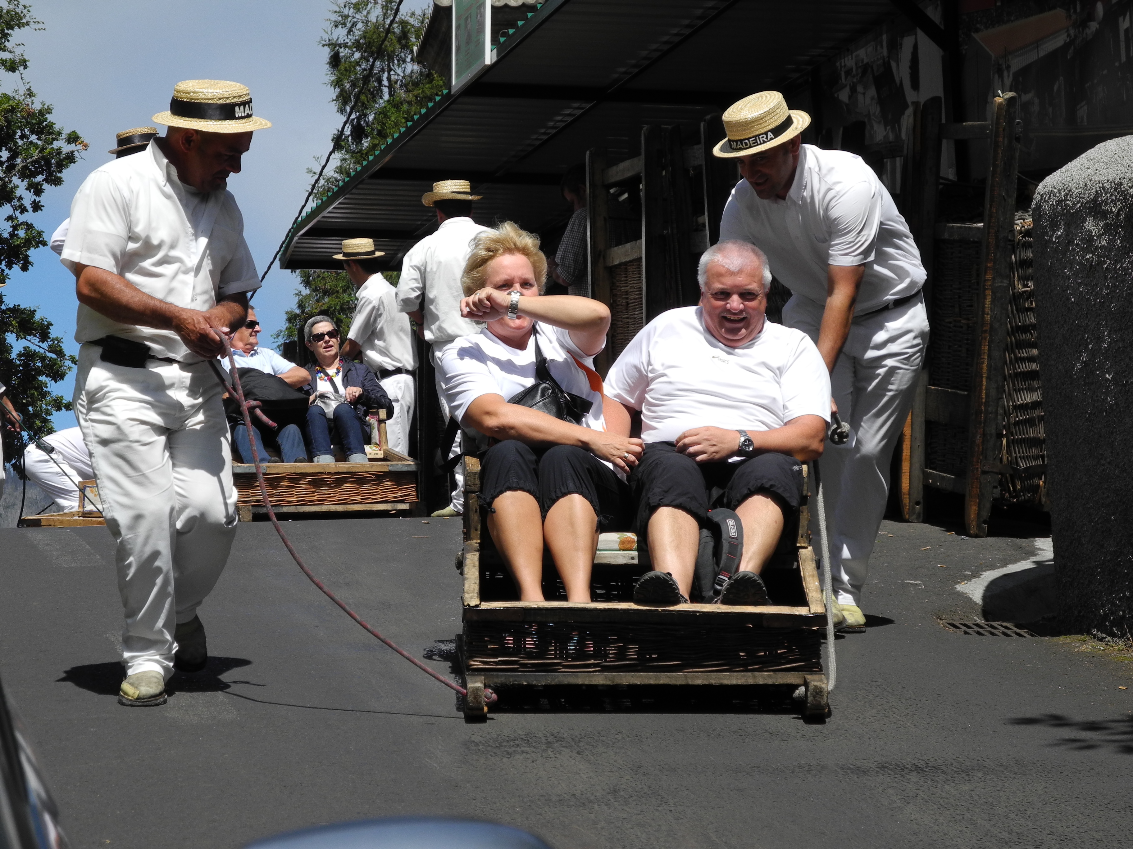 La descente en traineau de la longue pente abrupte de Monte (environ 2 km) est une attraction touristique renommée et impressionnante, comme le montre le visage de ces touristes.